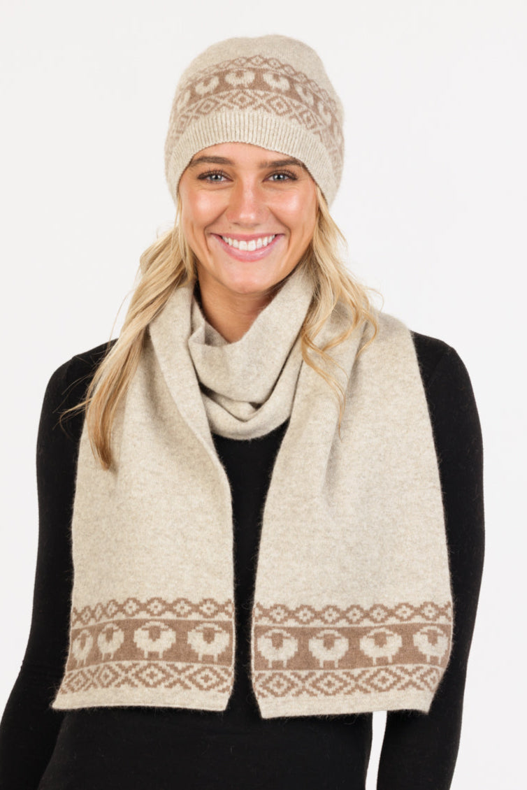 Knit from luxurious possum merino, this scarf offers exceptional insulation with a cashmere-like hand and minimal weight. A cute sheep pattern runs along the length of the scarf, celebrating the fibre’s origin and adding a crafted, story-rich detail that elevates everyday wear. The scarf is perfect for tourists to NZ, or as a gift for a loved one.